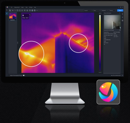 Il software incluso offre modalità flessibili (punti, linee, rettangoli, cerchi, poligoni) per analizzare le informazioni termografiche delle immagini acquisite e generare report.