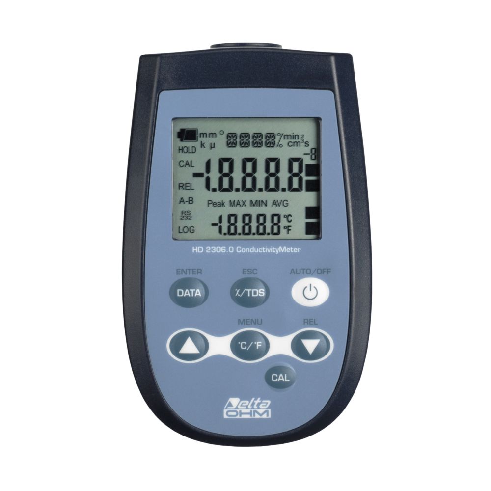 L’HD 2306.0 è uno strumento portatile con un grande display LCD. Misura la conducibilità, la resistività nei liquidi, i solidi totali disciolti (TDS) con sonde combinate di conducibilità e temperatura a 2 e 4 anelli. Misura la sola temperatura con sonde con sensore Pt100 o Pt1000 ad immersione, penetrazione, contatto o aria.