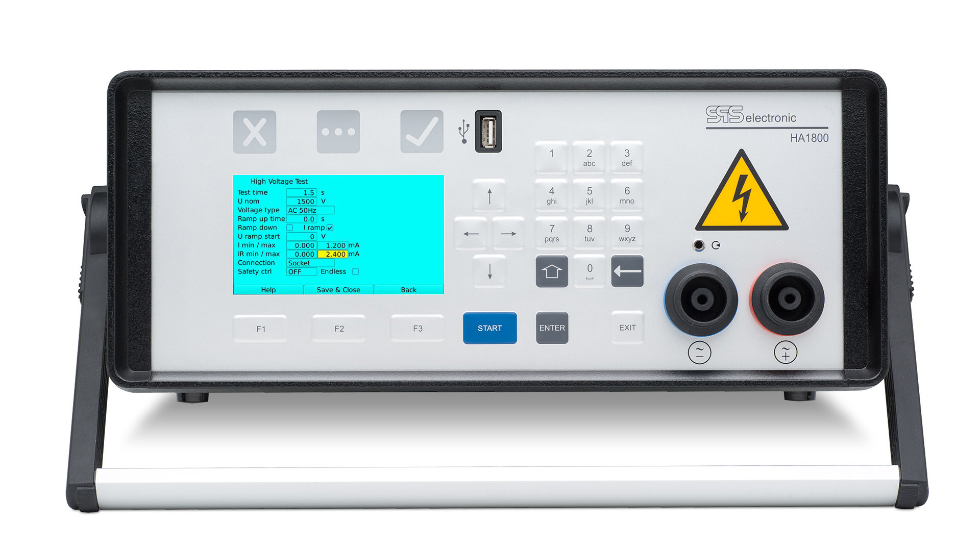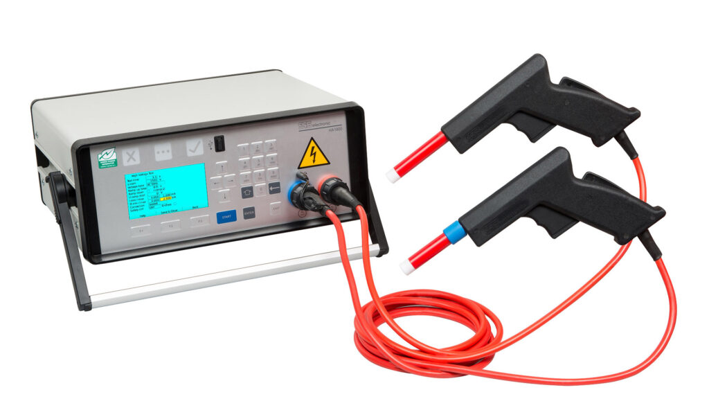 Con una corrente di cortocircuito di 3 mA AC e 10 mA DC, l’HA 1800M è limitato in corrente di sicurezza (in accordo con EN 50191) e facilita l’impostazione di una postazione di lavoro sicura. Questo consente l’utilizzo anche da parte di personale non elettricista qualificato. Il generatore di alta tensione completamente elettronico assicura test accurati e veloci.