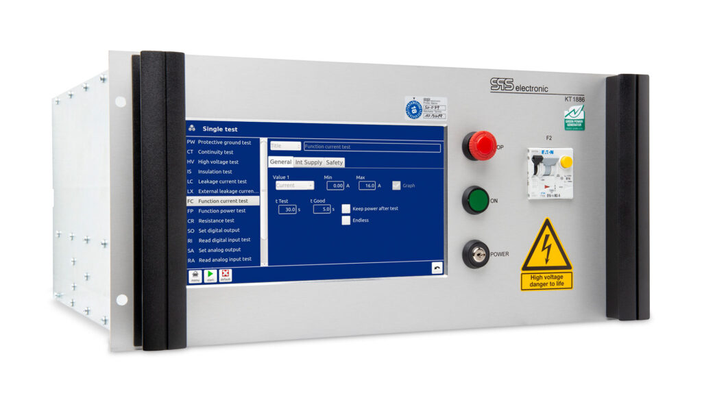 Il KT 1886J è un hipot safety analyser che combina in un unico dispositivo le prove di alta tensione (AC e DC), ground bond, misura d’isolamento, corrente di dispersione equivalente, test di funzione e test di continuità. Il test di funzione può essere integrato con una misura di potenza e, opzionalmente, con una misura di resistenza tra 0 e 1 kΩ.