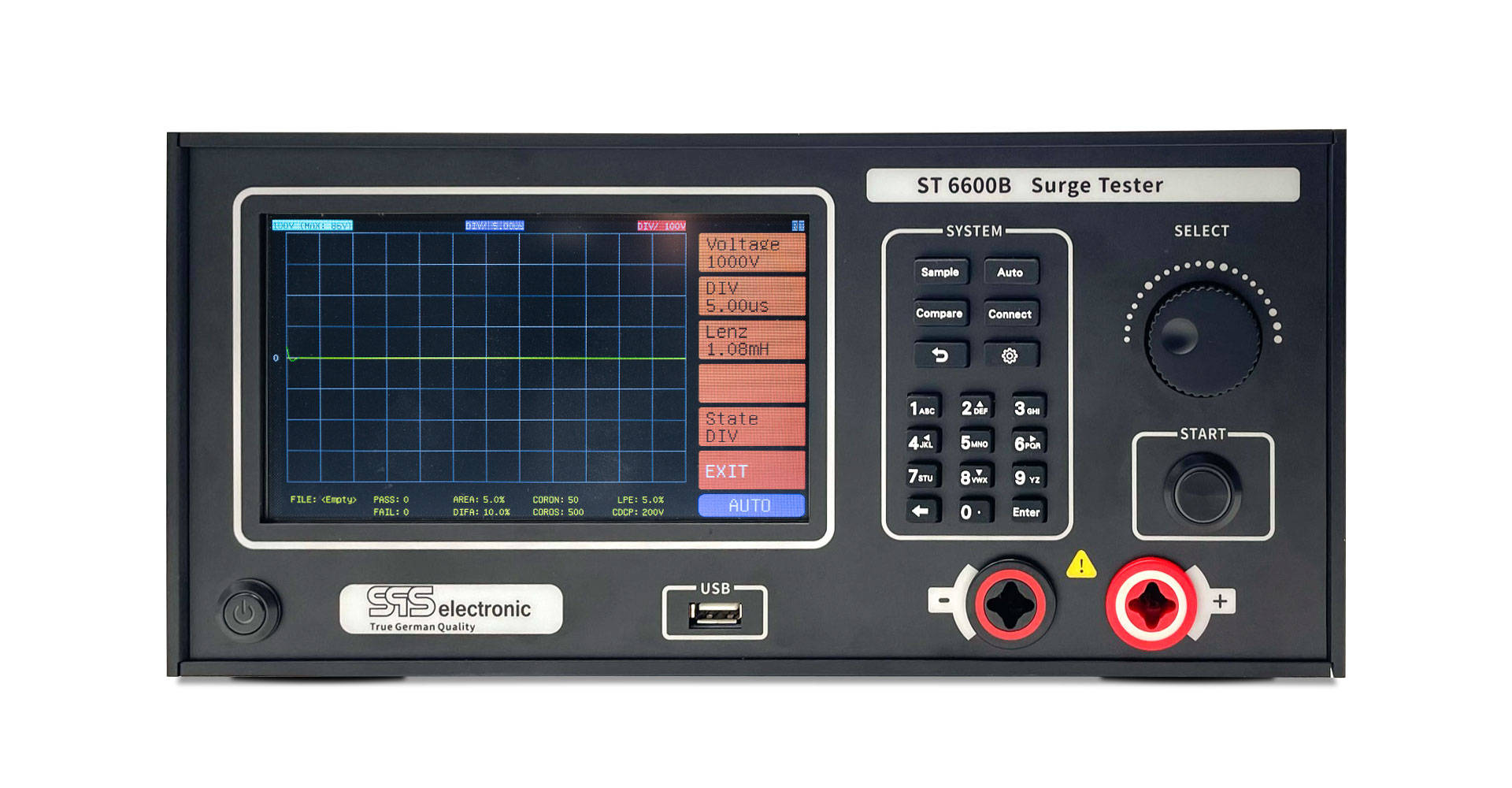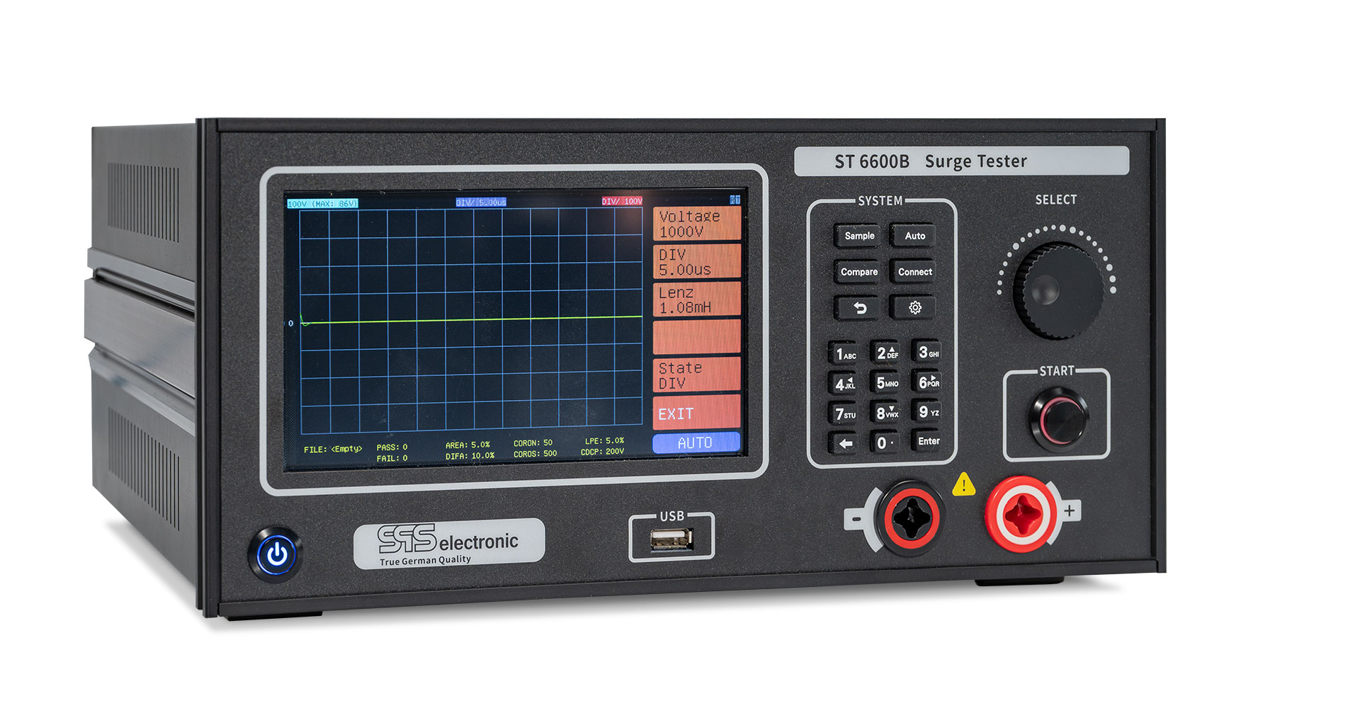 Lo ST 6600B consente di testare induttanze a partire da circa 10 µH. Tutte le bobine con induttanza superiore possono essere testate con il dispositivo. Lo ST 6600B valuta in base ai criteri definiti e mostra all’utente un risultato GOOD / FAIL. Il surgetester dispone di una memoria per 20 campioni di test; ulteriori campioni possono essere archiviati senza limiti tramite chiavetta USB. Il dispositivo può essere utilizzato insieme a un PC tramite interfacce TCP/IP, USB e RS-232, risultando adatto anche all’integrazione in sistemi di test automatici e linee di produzione.